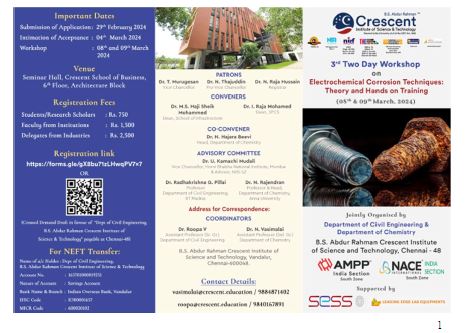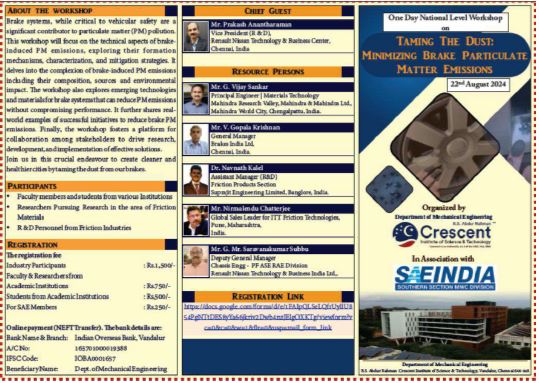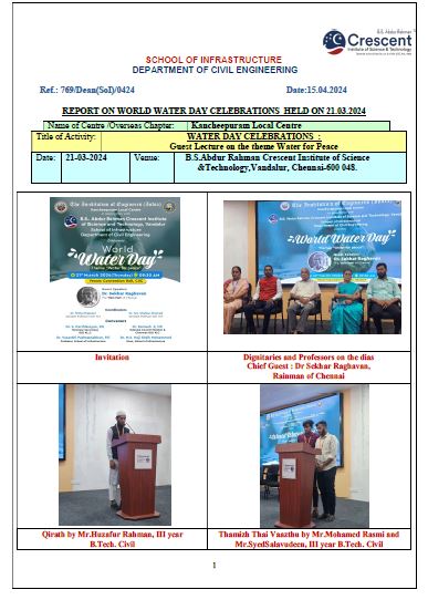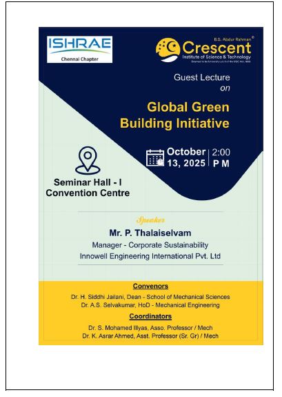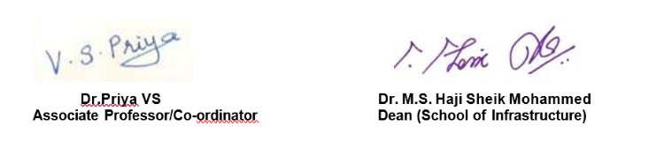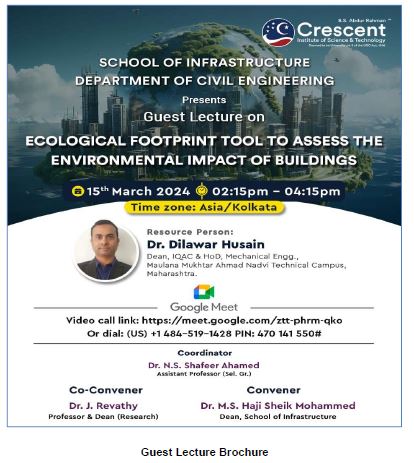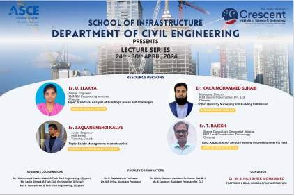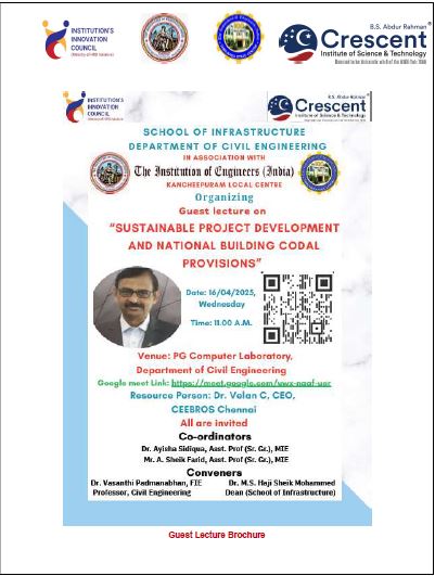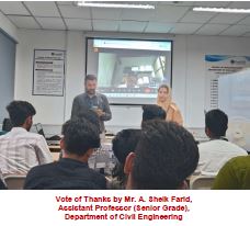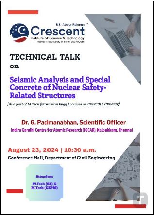 As part of the M.Tech (Structural Engineering) curriculum of the Department of Civil Engineering, B S Abdur Rahman Crescent Institute of Science and Technology, a technical talk was arranged for the courses CEE6101, Advanced Design of Concrete Structures and CEE6102, Dynamics of Structures on 23rd August 2024 from 10.30 a.m. to 12.30 p.m.