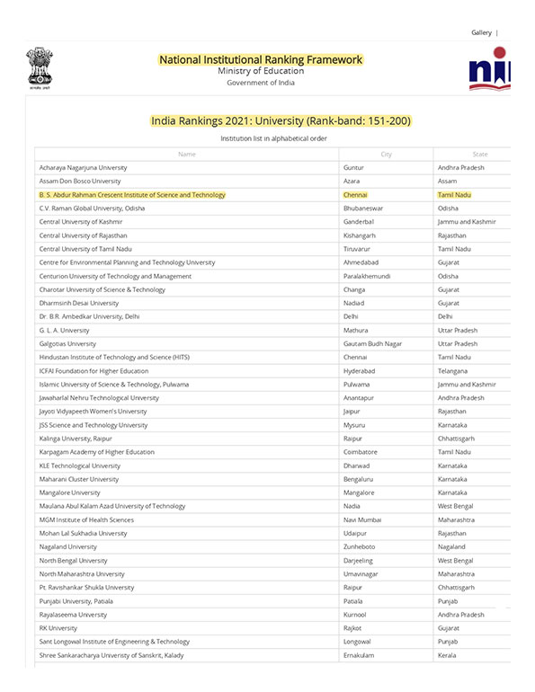 A. NIRF India Rankings B. THE Impact Ranking C. QS World University Ranking D. Data Quest E. ARIIA Certificate F. District Green Champion Certificate G. Tech 100 Higher Education Institutions Of India certificate H. India’s Top PJA Higher Education University Jury Certificate I. Cntral Vigilance Commission Certificate