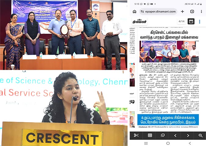 On March 20th and 21st, 2025, the District Level Viksit Bharat Youth Parliament 2025 was successfully organized at B.S. Abdur Rahman Crescent Institute of Science and Technology, Vandalur, Chennai on the topic “One Nation, One Election: Paving the Way for Viksit Bharat.” This event was held in collaboration with the Government of India, Ministry of Youth Affairs and Sports, NSS Regional Directorate Chennai, My Bharat – Nehru Yuva Kendra, Kanchipuram District, and the National Service Scheme (NSS) of B.S. Abdur Rahman Crescent Institute of science and technology.