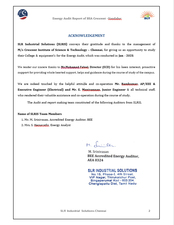 The university’s energy performance was formally audited by SLR Industrial Solutions, a BEE Approved Energy Audit Firm, as documented in the Energy Audit Report dated January 2025 for B.S. Abdur Rahman Crescent Institute of Science and Technology, Chennai. The audit was conducted with the support of the institution’s management and technical staff and provides a structured assessment of campus-wide energy consumption, system performance, and energy-saving opportunities.